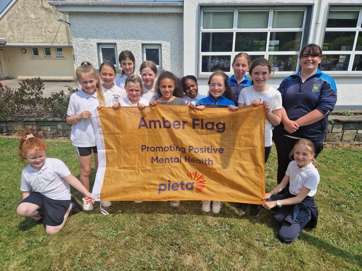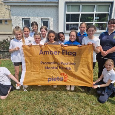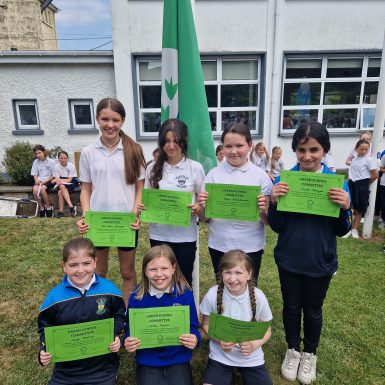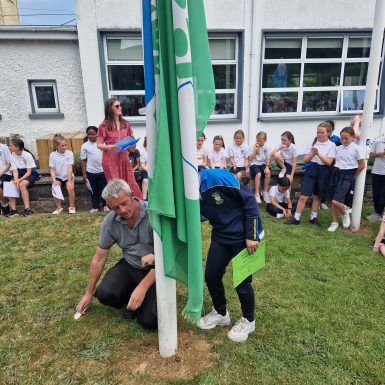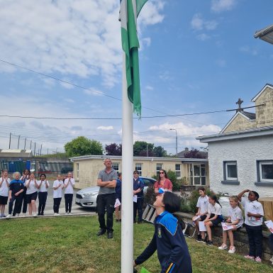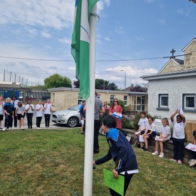On Tuesday 13th June we held a flag raising ceremony for the 2 flags we achieved this year – the Green School Flag and the Amber Flag for Promoting Positive Mental health.